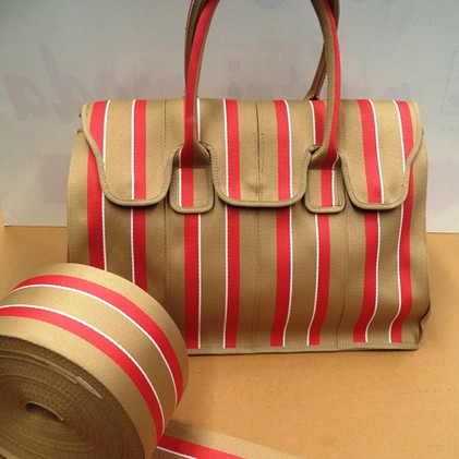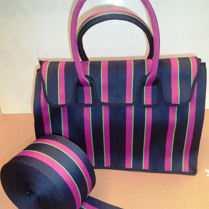 BO-Striped trunk, made by joining 12 cm high polyester ribbon to form the body of the bag